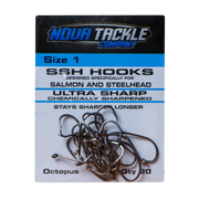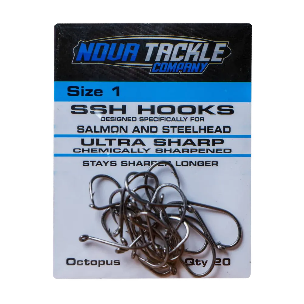 The Nova SSH Octopus Hooks are constructed of carbon black forged steel in an extremely light weight but heavy duty design. Utilizing wire strong enough to handle the largest fish, these hooks are chemically sharpened to penetrate on hook set. These hooks is specifically designed for Salmon and Steelhead fishing. The turned up eye is ideal for snell knots and egg loops.
