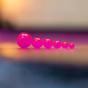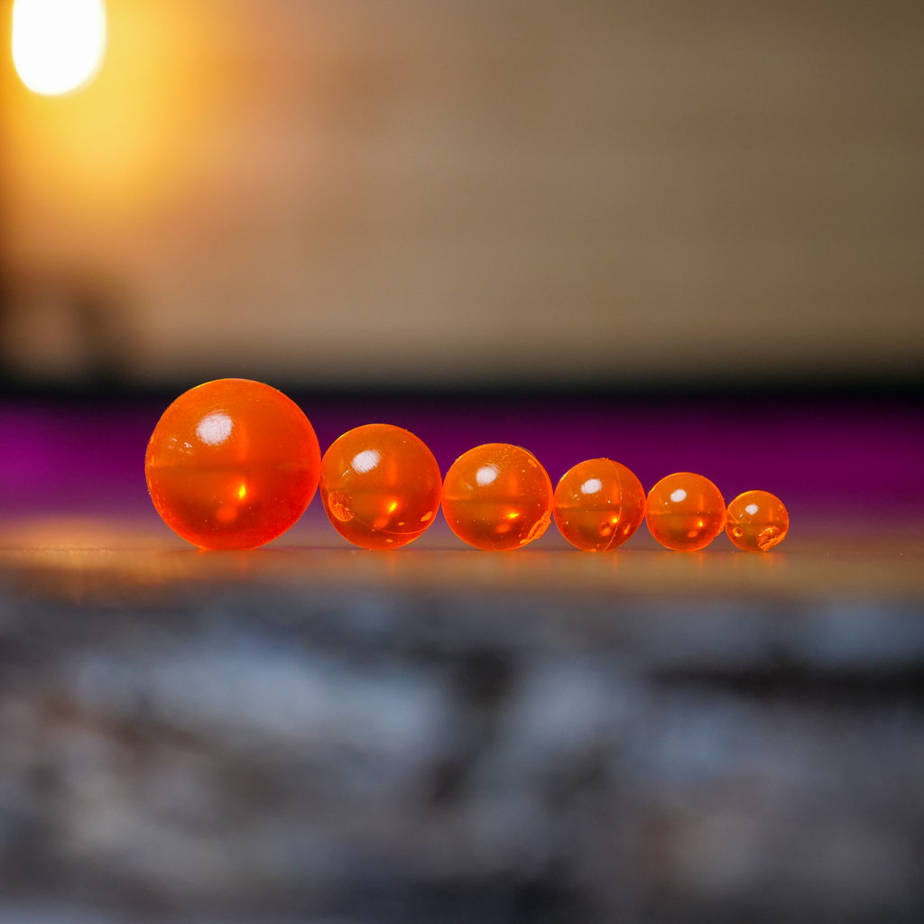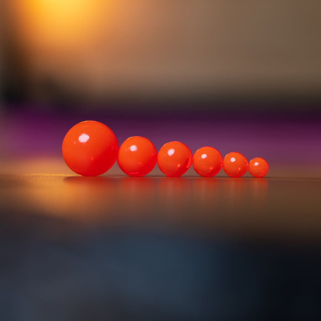 This is the ultimate steelhead bead system. We use high quality, ultra clear plastic and transparent multi-dimensional pigments to create the most realistic beads/egg patterns on the market. Our proprietary plastic is neutrally buoyant so is slowly sinks when it floats down the river and the current moves around naturally just like the real thing. Each kit comes with small transparent glass beads (dark red) to imitate an embryo in real fish eggs. These small glass beads are used for pegging your soft bead for a natural presentation.